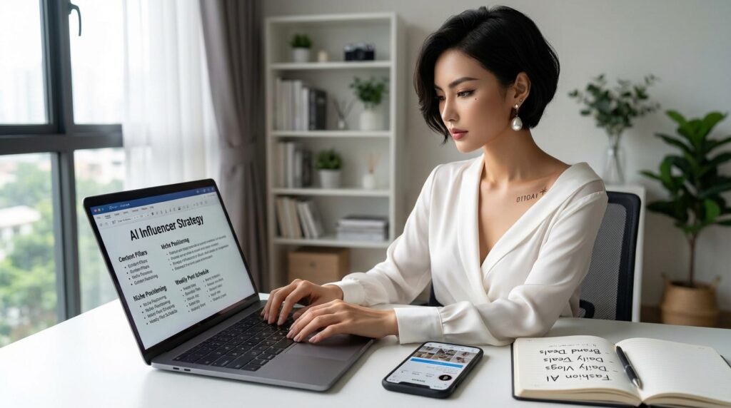 Run a niche-audience clarity session in ChatGPT: “I want to build an AI influencer account. My character’s aesthetic is [description]. Suggest three specific niche positions within [broad category] that have underserved AI influencer presence, clear audience demand, and strong brand partnership potential. For each, describe the target audience in detail.”